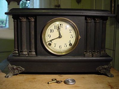 Title (ebay affiliate link): ANTIQUE SESSIONS 6 COLUMN BLACK ENAMEL MANTEL CLOCK 8 DAY ORIGINAL WORKING
