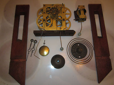 Antique Waterbury OG clock movement, hands, bell, gong, pendulum, boards LOT