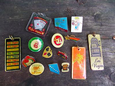 Title (ebay affiliate link): 15 VINTAGE LAS VEGAS PINS & KEYCHAINS, ENAMELED, LUCITE, METAL, GAMBLING MOTIFS