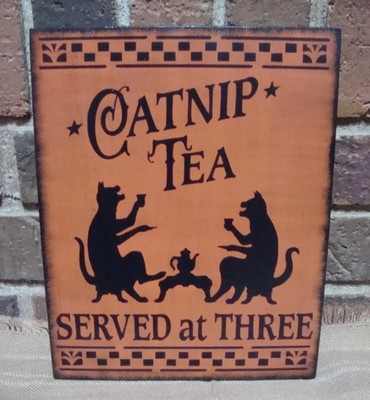 Primitive Style Halloween Wood Black Cat Sign CATNIP TEA SERVED AT THREE Hp