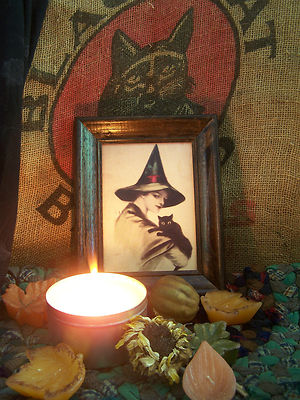 Title (ebay affiliate link): PRIMITIVE-Vtg-HaLLoWeEN-WiTcH/BLaCk CaT/CaPe-Spooky-Portrait Print-Wood Frame