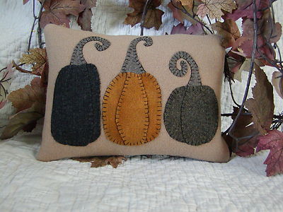 Title (ebay affiliate link): Folk Art Fall Wool Pillow~Three Pumpkins~Autumn~Halloween~Thanksgiving