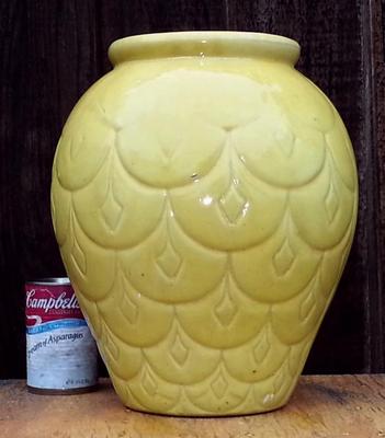 BIG Antique OHIO ART POTTERY Vase JAR Country Art Deco YELLOW Waves & Spears