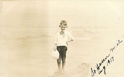 Title (ebay affiliate link): South Haven Michigan~Skinny Kid on Driftwood~Waves~White Hat~Bow Tie~1917 RPPC