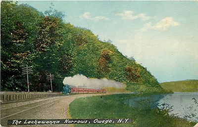 Title (ebay affiliate link): Owego New York~The Lackawanna Railroad Narrows~Steam Locomotive Train Curve~1907