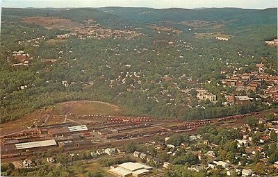 Title (ebay affiliate link): Oneonta New York~Aerial View: Homes~Business~Railroad Box Cars~1960s Postcard