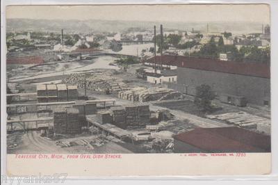Title (ebay affiliate link): VIEW OF LOG - LUMBER YARD - TRAIN HAUL - OVAL DISH STACKS - TRAVERSE CITY MI