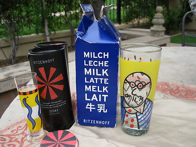 Title (ebay affiliate link): RITZENHOFF MILK GLASS, 2 SCHNAPS GLASSES AND COASTERS-3-NIB