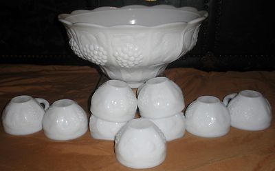 Title (ebay affiliate link): Vintage Milk Glass Punch Bowl Set W/ 9 Cups Grape Harvest Paneled Leaf Leaves