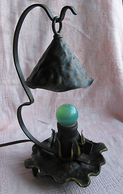 Title (ebay affiliate link): Vtg Arts & Crafts hammered cast iron electric table lamp Hanging bell shade