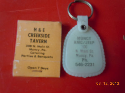 MUNCY PA AMC JEEP KEYCHAIN and H & E CREEKSIDE TAVERN MATCHES VINTAGE ADS