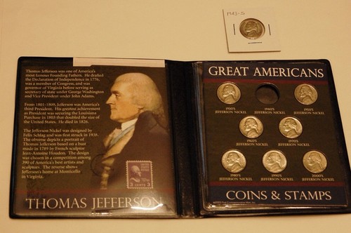 Title (ebay affiliate link): Jefferson 8 Nickel Coin and 3 Cent Stamp Set including 1943-S Silver War Nickel!