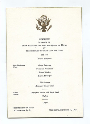 1967, US Secretary of State Dean Rusk Menu In Honor of King & Queen of Nepal