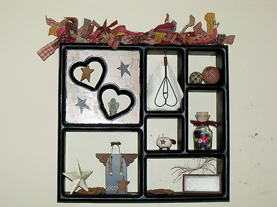 Title (ebay affiliate link): Primitive Country Crackle Gathering~Square Shelf w/ Cubby Boxes~Tons of Accents