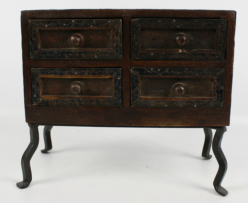 DECORATED MINIATURE CHEST DRAWERS HAMMERED METAL SALESMAN SAMPLE 11" x 5" x 10"