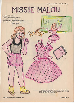 Title (ebay affiliate link): *Missie Malou* Paper Dolls - Page from Children's Friend Magazine - 09/1954
