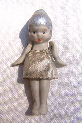 Title (ebay affiliate link): Antique bisque doll silver painted hair ribbon dress wired arms 3" tall