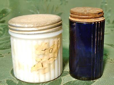 2 Antique Cosmetic Bottles Cobalt Blue & Milk Glass