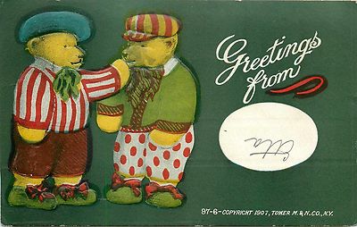 Title (ebay affiliate link): FANTASY~Dressed Teddy Bears~Stripes & Polka Dots~Hunter Green~Emboss~1907 Tower