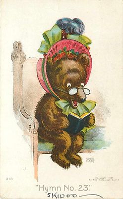 Rose Clark Bears~Fantasy~Girl Grizzly~Sunday Bonnet~"Hymn No 23"~Church Pew~1907