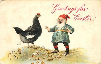 Fantasy~Easter Gnome Finds Hen that Lays Gold Coin Filled Eggs~Jenny Nystrom~'11
