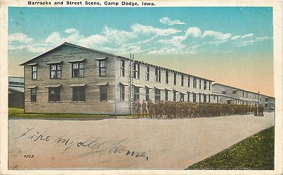 Title (ebay affiliate link): Camp Dodge Iowa~Barracks & Street~Men on March~Like My Old Home~1918 Postcard