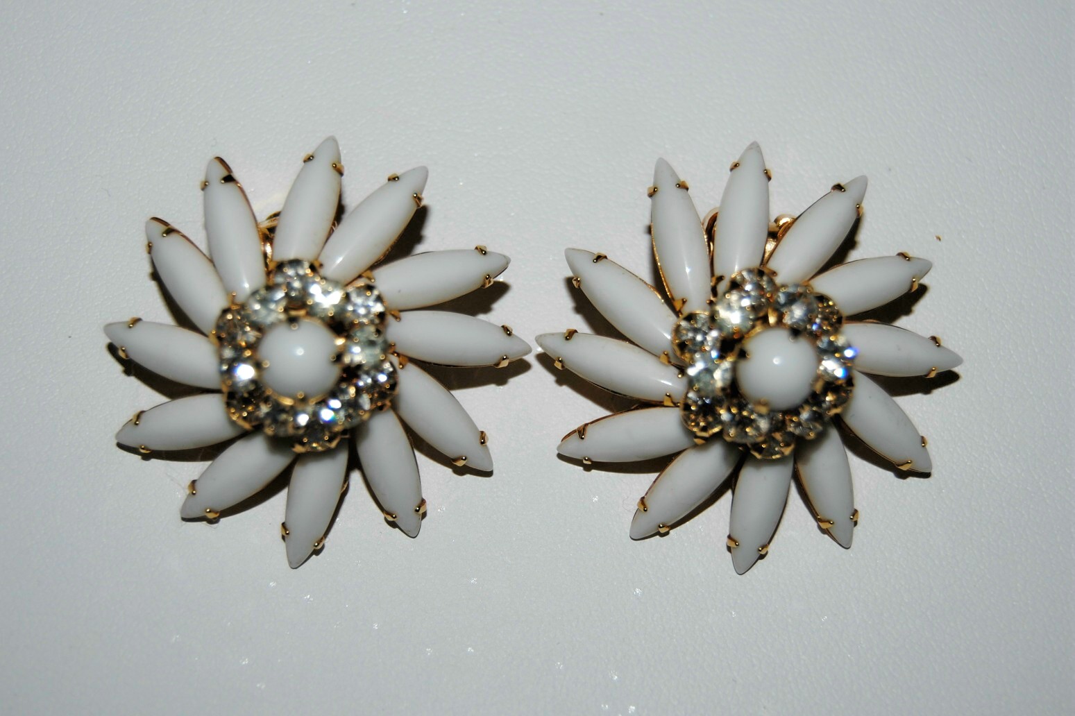 Vtg DESIGNER Milk GLASS Rhinestone EARRINGS Judy LEE