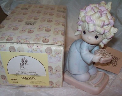 Title (ebay affiliate link): Precious Moments * Spirit Willing Flesh Weak * girl w/ curlers / candy on scale