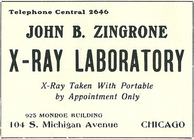 1916 JOHN B. ZINGRONE, X-RAY LABORATORY, CHICAGO, ILLINOIS ADVERTISEMENT
