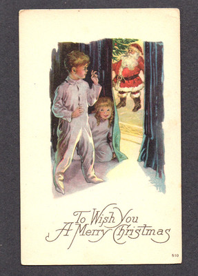 Title (ebay affiliate link): Antique Postcard Santa Claus s/510 K Children Peeking Girl Boy Pajamas UU VG