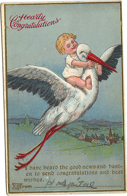 Title (ebay affiliate link): Birth Announcement Congratulations vintage 1914 postcard baby riding stork