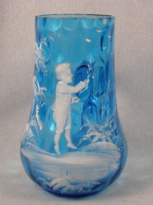 Antique Mary Gregory Boy On Inverted Thumbprint Blue Glass Mug