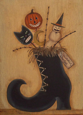 Title (ebay affiliate link): *~*PRIMITIVE*~* HP FOLK ART WITCH BOOT *~* CAT & PUMPKIN MASKS *~* DOOR PANEL