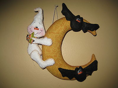 PRIMITIVE HC HALLOWEEN HANGING GHOST DOLL ON MOON WITH 2 BATS ORNIE