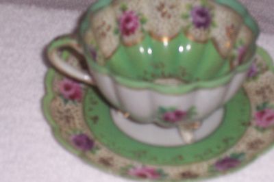 Title (ebay affiliate link): VICTORIAN TEA CUP & SAUCER W/FLOWERS AND GOLD TRIM & GOLD & WHITE SHELLS LEGS