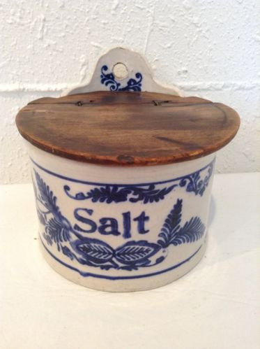 Title (ebay affiliate link): Antique Stoneware Blue White Lidded Salt Crock Hanging Wooden Cellar Box