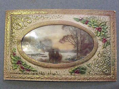 Vintage 30's 40's Christmas Postcard Raised Center w/Winter Horses Scene