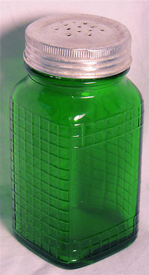 Title (ebay affiliate link): Vtg 30's Owens Illinois Green Depression Glass Waffle Grid Pattern Range Shaker
