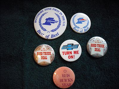 (5) VINTAGE CHEVROLET BUTTONS AND (1) BUICK BUTTON FROM 1961 MOTORAMA