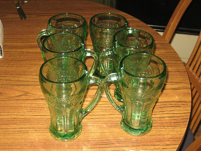 Title (ebay affiliate link): 6 Vintage COCA COLA Glass Mugs Green Tint Mason Jar Coke Bottle Shape Indiana