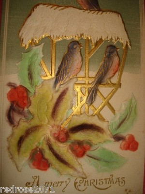 Title (ebay affiliate link): ANTIQUE old Holiday Christmas Postcard Raised Velvet Holly Birds Gold Trim