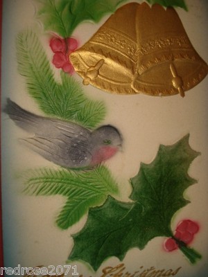 Title (ebay affiliate link): ANTIQUE old Holiday Christmas Postcard Raised Velvet Holly Bird Gold Bells