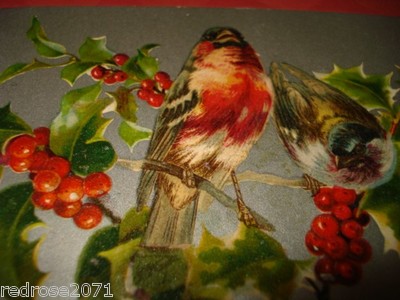 VINTAGE OLD holiday CHRISTMAS postcard CUTE BIRDS on tree branch HOLLY - SILVER