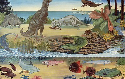 Title (ebay affiliate link): VINTAGE ART postcard of DINOSAURS PREHISTORIC CREATURES PURBECK DORSET