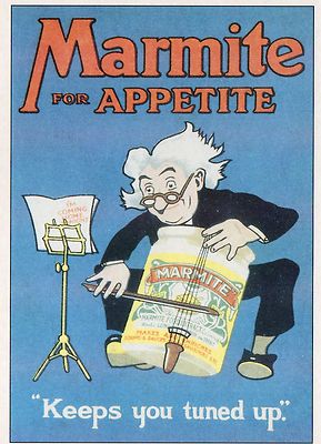 Title (ebay affiliate link): MODERN REPRO postcard of MARMITE ADVERT WITH MAN PLAYING 'CELLO'