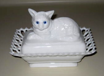 WESTMORELAND CAT KITTEN MILK GLASS DISH GLASS EYES OLD