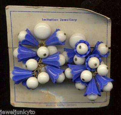 NOS Vintage W GERMANY BLUE FLOWER MILK GLASS EARRINGS