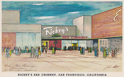 Title (ebay affiliate link): RICKEY'S RED CHIMNEY, SAN FRANCISCO, CA. OLD CHROME POSTCARD PM 1956