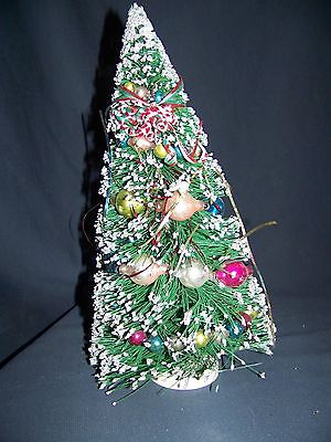 13"Vintage GREEN with SILVER-GLASS BEAD/TINSEL/RIBBON DECORATED BRUSH XMAS TREE