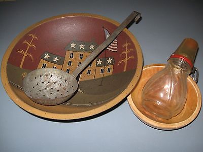 Primitive Folk Art Bowl~Vintage Nut Grinder~Old Metal Ladel~ Wooden Bowl~Lot